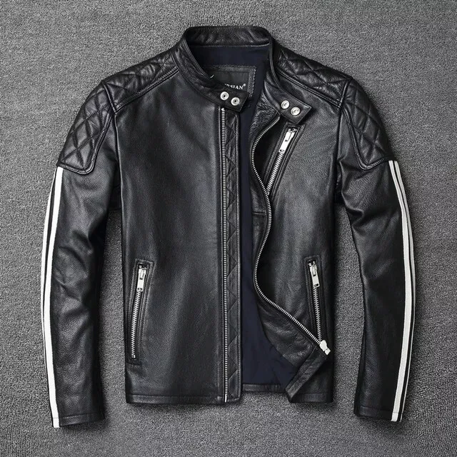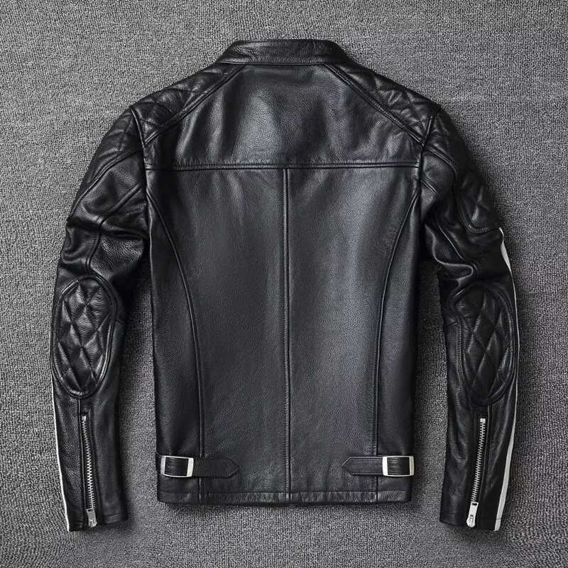 Men’s Black Moto Leather Jacket with White Racing Stripes & Quilted Shoulders