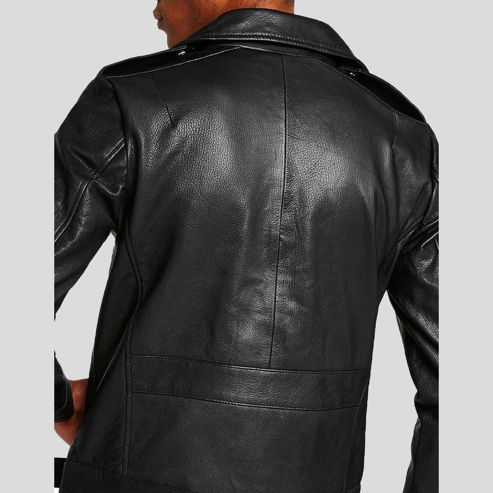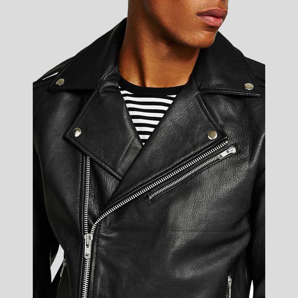 Crafted from premium lambskin leather, this men’s handcrafted black leather biker jacket features quilted detailing, an asymmetrical YKK zip, and a warm fur-and-viscose lining—built for bold style and everyday comfort.
