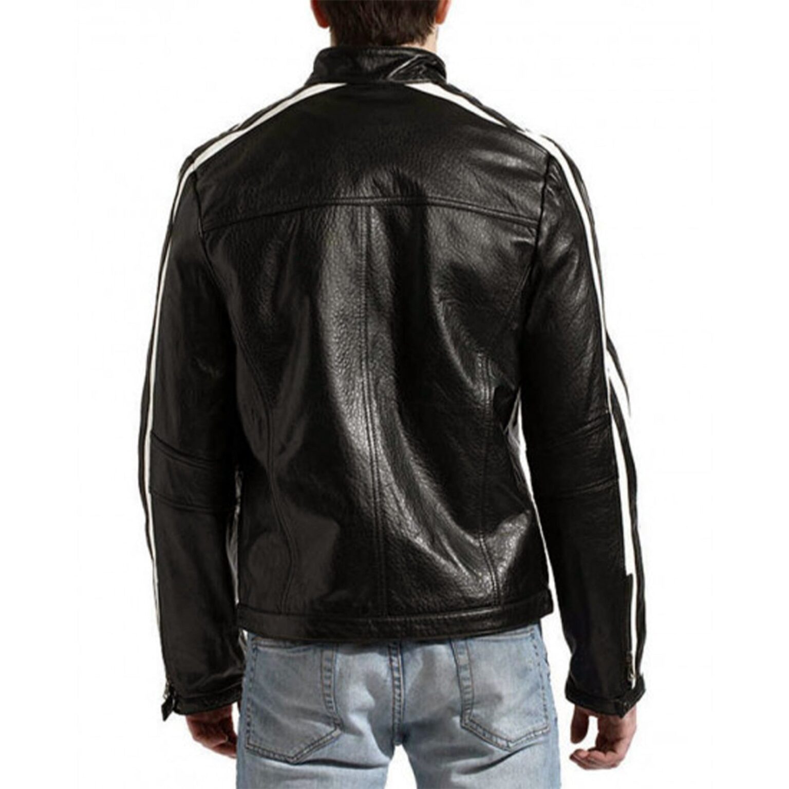 Fuel your style with this Men’s Black Leather Racer Jacket with White Stripes by VogueLayer, a modern classic inspired by vintage motorsport fashion. Crafted from 100% genuine lambskin leather, this jacket offers exceptional softness, durability, and flexibility—perfect for riders and style enthusiasts alike.