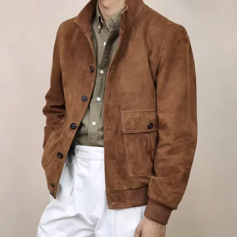A heritage brown suede bomber jacket by VogueLayer, featuring utility flap pockets, ribbed cuffs, and a tailored fit for effortless everyday sophistication.