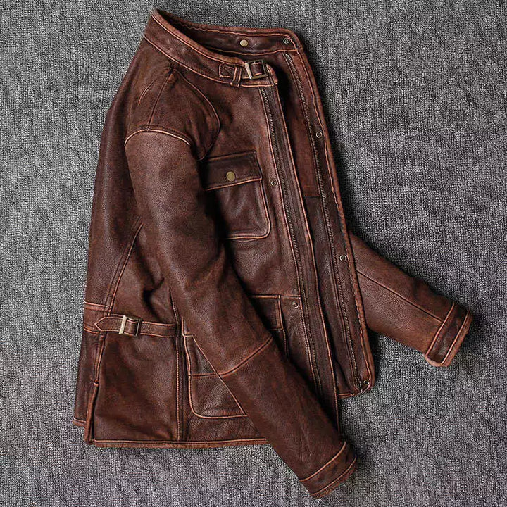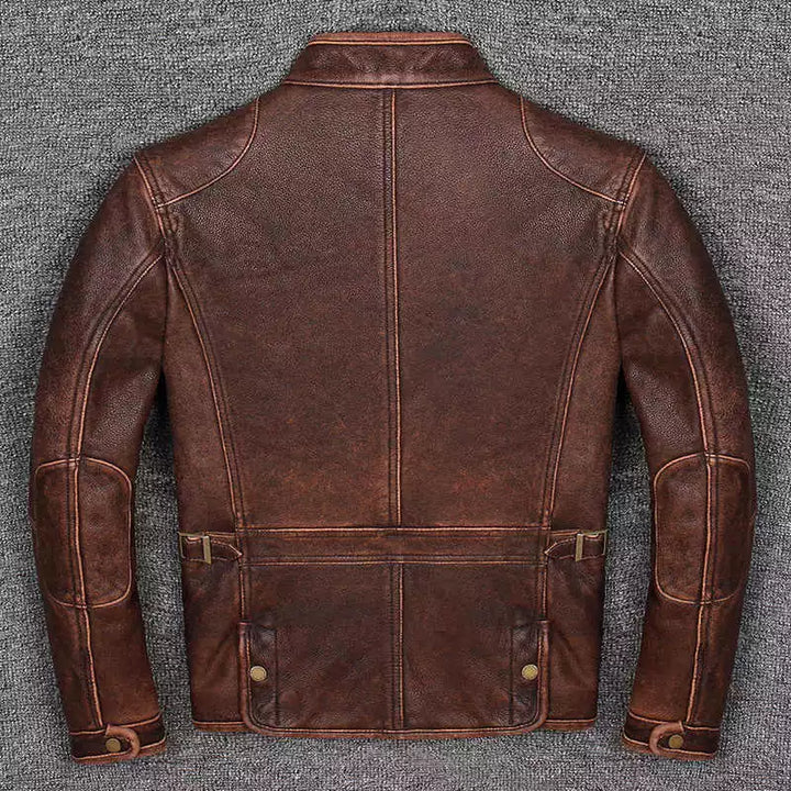 Distressed finish adds a vintage, rugged appeal, making each jacket unique.