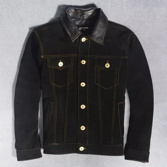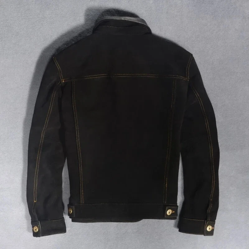 Made from premium black suede, the jacket offers a rich, velvety finish that feels as good as it looks. The standout genuine leather collar adds contrast and durability, while golden contrast stitching enhances its rugged character without overpowering the refined design.