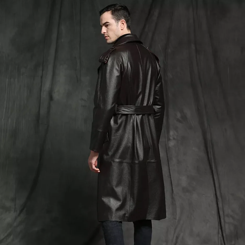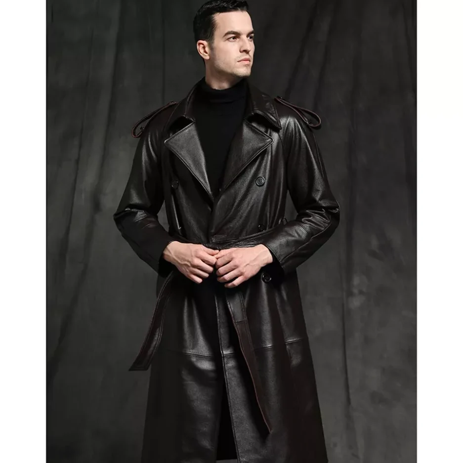 Command attention in this premium black leather trench coat featuring a belted waist, shoulder epaulettes, and a sleek double-breasted design—crafted for men who prefer bold, refined style.