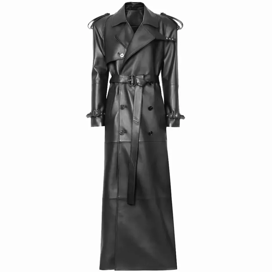 Make a fierce fashion statement with this full-length military-inspired black faux leather trench coat, featuring shoulder epaulettes, storm flaps, and a structured waist belt for a commanding silhouette.